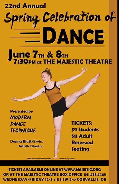 We are a dance program in Corvallis, Oregon providing Modern Dance classes for ages 6-21 (including beginning teens and advanced classes) and Creative Movement classes for ages 4 1/2 to 6. Registration begins August 19th and continues until classes are full.